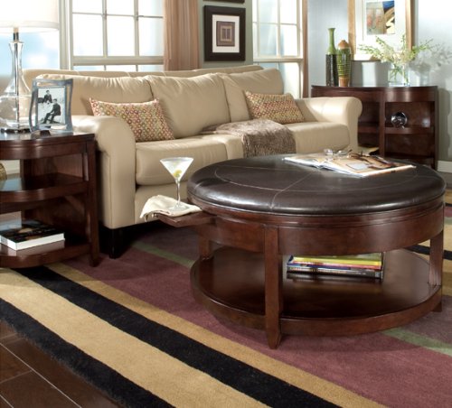 Neo-classic styling merging the comfort of an ottoman with the functionally of a cocktail table, this is Brunswick. Our cocktail displays a top of synthetic leather with tone on tone topstitching. Note the pull-trays on either side of this piece. This is crafted of cherry Veneers and hardwood solids making a great companion for contemporary seating. Features: Constructed of hardwood solids and cherry veneers Shelves for storage Pull-trays on either side of cocktail table Includes sofa, cocktail and end table Finish: Coffee Bean Dimensions: End Table: 26W x 19D x 24H Cocktail Table: 38W x 38D x 19H Sofa Table: 48W x 18D x 28H
