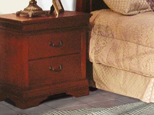 Louis Philippe Nightstand is smaller in height than Cabinet collection. It is made with cherry finish solid wood veneers over MDF. It has been constructed with Antique pewter bail-style hardware on inset drawer fronts, routed panels on the headboard and footboard, & routed posts on the pedestal legs with Solid natural wood 5-piece pinned drawer construction, wood drawer glides and dust proofed bottom drawer. Finish: CherryDimensions:29 x 27 x 17