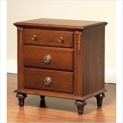 40-04 (Antique Black/Brass) Finish: Antique Black, Knobs: Antique Brass Knobs The British Isle Collection is constructed from soft maple wood which magnifies the intricate detailing of the collection. The nightstand is bordered by groove detailing and is accented by a distinctive leaf design. Features: -Available in Tobago Red, Antique Brown, Antique White, and Antique Black finishes -All British Isle Collection pieces will be distressed unless customer specifies otherwise -Constructed completely of quality solid hardwoods (as with all natural wood pieces, finish may vary slightly) -Protective finish resists stains, rings, marks, and spotting, scratches and abrasions, and heat damage. Chatham recommends cleaning with a damp cloth and mild detergent, wiped dry with a soft cloth. Should a polish be desired, furniture polish containing no waxes or silicones is recommended -Covered by manufacturer's one year warranty -2 large pullout drawers -2 small pullout drawers -Available with antique brass knobs or drop-pulls Specifications: -All Antique White and Antique Black finishes will be noncancelable and nonreturnable due to the custom nature of the product -Overall dimensions: 28'' H x 26'' W x 17'' D -Drawers 11.375'' D About Chatham Furniture: Chatham Furniture was born in June of 1993 and is located in Amesbury, Massachusetts. Because of the superb workmanship of their experienced craftsmen and the dedication of everyone involved in Chatham Furniture, they are now approaching our 12th anniversary. The employees of Chatham Furniture strive for quality, design excellence, service and value in solid wood furniture...so that each of their customers will have furniture to pass down from generation to generation.
