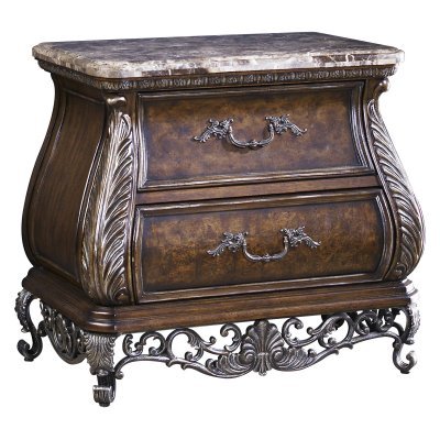 Shop for Nightstands from BedroomFurnitureMart.com! Reaching over to turn off the alarm might not seem like the most glamorous thing you can do but when that alarm clock is sitting on the Birkhaven 2 Drawer Nightstand your morning is sure to start a little more elegantly. Crafted with durable select hardwood solids and mappa burl and birch veneers finished in a deep mocha brown with gold and silver highlights this standout nightstand has plenty of starring components: a soft bombe shape acanthus leaf pilasters with metallic tipping a scrolled metal base with cast overlays textural egg-and-dart undertop molding and a thick marble veneered stone top.Stash magazines reading glasses tissues lotions and other bedside essentials in two dovetailed drawers that slide smoothly on wood-on-wood drawer guides. Framed drawer fronts and side panels along with high-drama custom-designed hardware are artful finishes to this practical storage unit. Coordinates with our other Birkhaven collection pieces.About Pulaski FurnitureFounded in 1955 in Pulaski Va. and taking the name of the town as its own Pulaski Furniture was originally established as a maker of bedroom and dining room furniture. Recently celebrating its 50th anniversary Pulaski Furniture is one of the top 40 furniture importers in the United States. Now a division of Home Meridian International Pulaski Furniture Corporation continues to outperform with stylish and innovative product development designing and building a broad selection of collectors cabinets accent pieces and bedroom and dining furniture for your lifestyle needs.